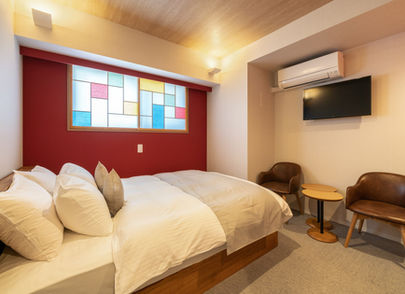 The stained glass in the lobby hall is a symbol of the Art Deco Hotel. The colors shining through the canvas of light may resemble the bustle of Nishiasakusa, as it shows a completely different look depending on the sunlight in the daytime, the light at night, and the time and place of viewing.