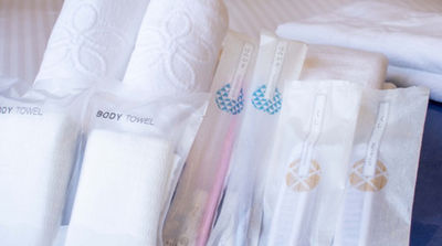 Towel sets, Slippers, Shampoo, Conditioner, Body Soap, Toothbrushes, Comb